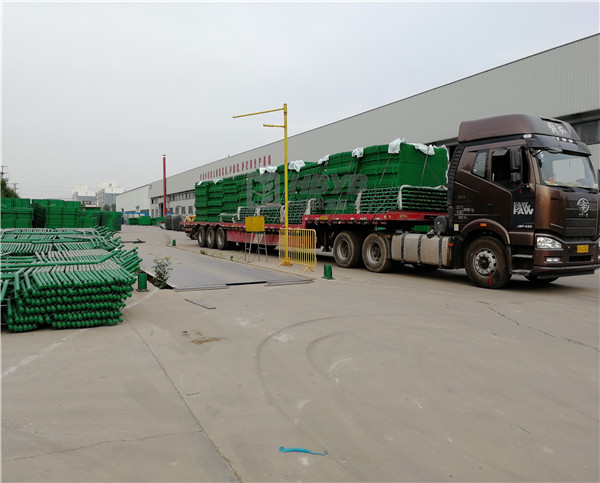 昨天傍晚6:30分,一辆17m的大板装满三道弯双边丝隔离栅从工厂发货,快速运往吉林工地。
