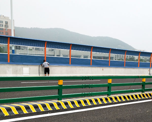 该镀锌板消声屏障规格为3m高*2m中心,上部采用弧形百叶孔声屏障,中间采用夹胶玻璃,下部采用隔声板,材质为1.0mm镀锌板。吸隔声板喷涂蓝色,立柱喷涂橘黄色,整体色彩搭配非常新鲜,给人非常愉快的观赏感观。