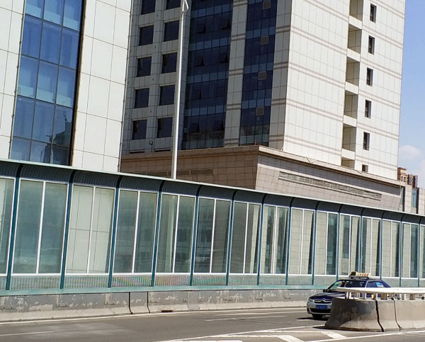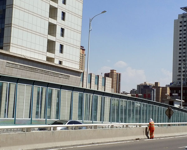桥梁段声屏障高度,常见高度有2m、2.5m、3m、3.5m。该立交桥声屏障高度为3.5m,因采光需求,特选用大面积透明窗,占2.5m,为保障安全,透明窗中间加了一道横撑。