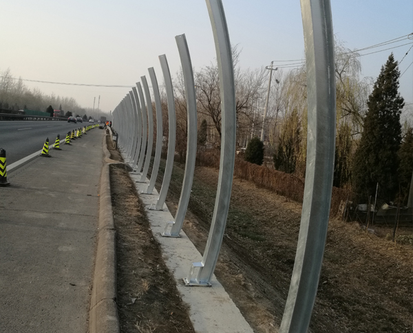 弧形半封闭隔声屏障采用150*150规格H型钢立柱,吸声屏体采用1.0mm镀锌板,冲百叶孔。