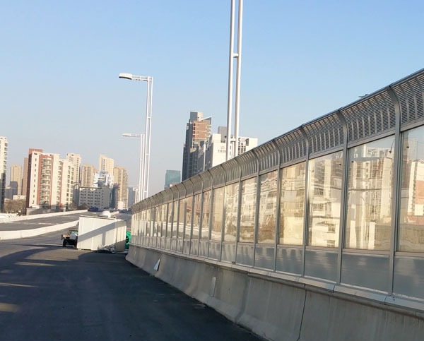 弧形透明桥梁声屏障主要由钢结构立柱和吸隔声屏板两部分组成,立柱是声屏障的主要受力构件,它通过螺栓固定在道路防撞墙或轨道边的预埋钢板上;吸隔声板是主要的隔声吸声构件,它通过弹簧卡子将其固定在H型立柱槽内,形成声屏障,外形美观大方,制作精致,运输、安装方便,造价低,使用寿命长,是现代化城市理想的隔声降噪设施。