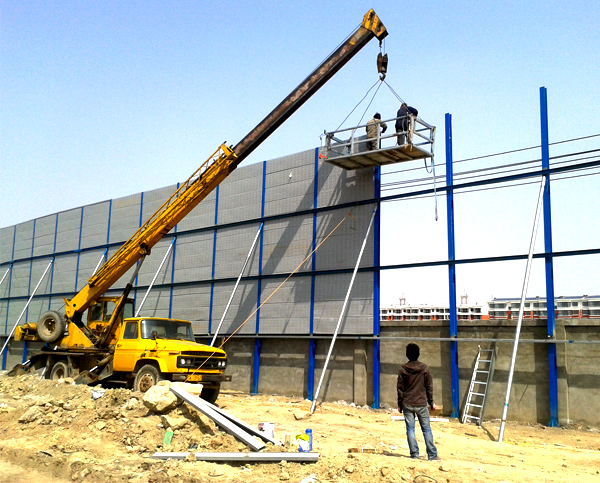 工厂厂界降噪声屏障主要由钢结构立柱和吸隔声屏板两部分组成,立柱是隔音墙的主要受力构件,它通过螺栓或接焊固定在墙体或地面预埋钢板上;吸隔声板是主要的隔声吸声构件,它通过强高弹簧卡子将其固定在H型立柱槽内,形成隔音墙。