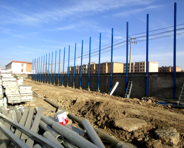 该工厂厂界降噪声屏障高4m,在围墙位置安装,通过加装圆管斜撑增加声屏障稳固强度。