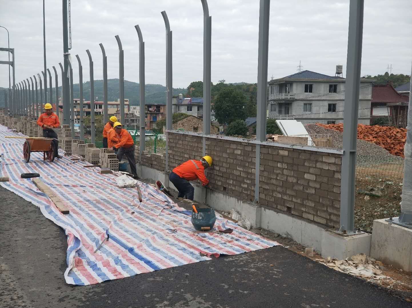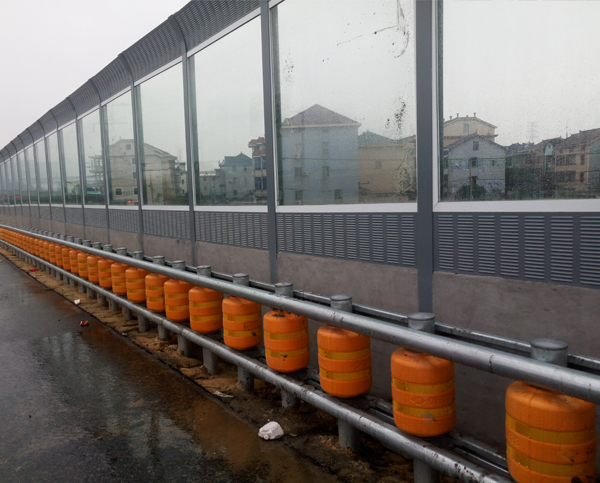 该百叶孔公路吸声板声屏障规格为4m高*2m,上部为500mm弧形百叶孔吸声板,中间为2000mmPC板,厚度为10mm,下部为400mm直线百叶孔吸声板,砌墙部分高1100mm,采用125厚砖墙,1:2水泥砂浆双面抹灰,正面刷浅灰色外墙涂料。