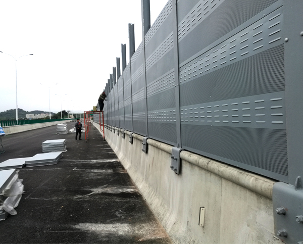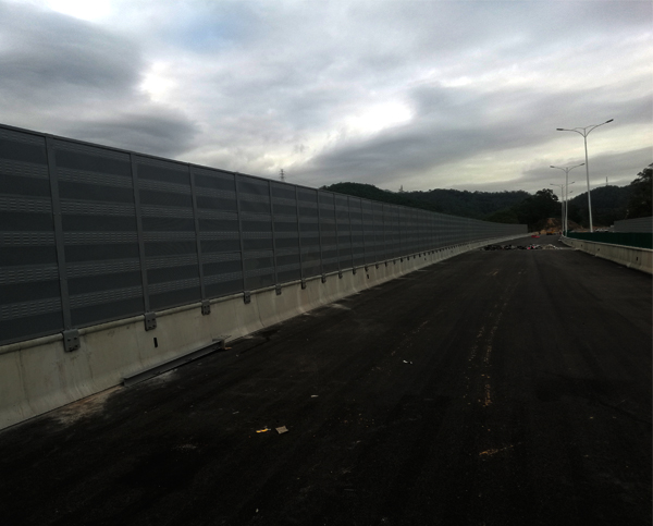 高速公路声屏障规格为3m高*2.5m,吸声板样式非常新颖独特,采用一半冲百叶孔,一半冲微孔,这种吸声板在其他工程案例中是非常少见的,为本声屏障工程特色。