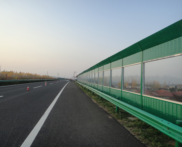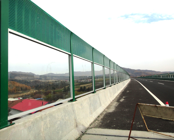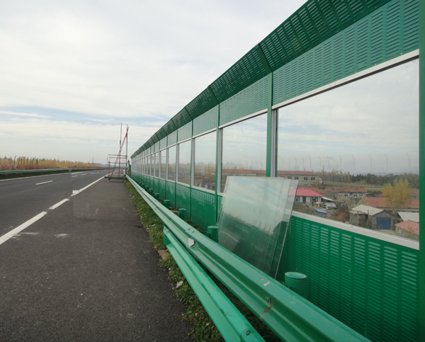 该高速公路隔音墙采用顶部折臂型,中间采用夹胶玻璃,整体喷涂绿色,成为辽阔大地上的一道绿色风景线。
