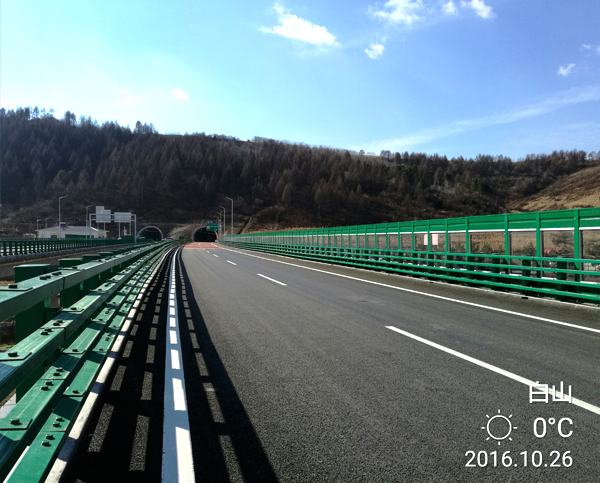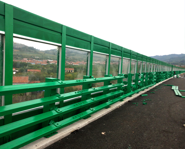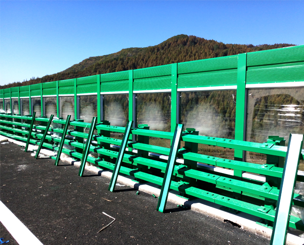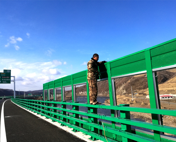 高速公路声音屏障规格为2.5m高*2.5m,直立式,声音屏障结构为上下凹凸槽吸声屏体,中间为1.5m高夹胶玻璃,喷涂绿色,配上当地蓝蓝的天,可谓美不胜收!