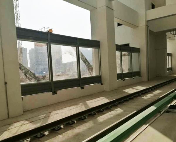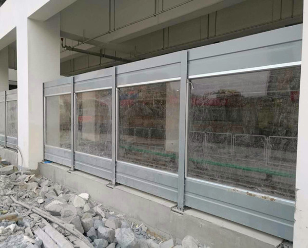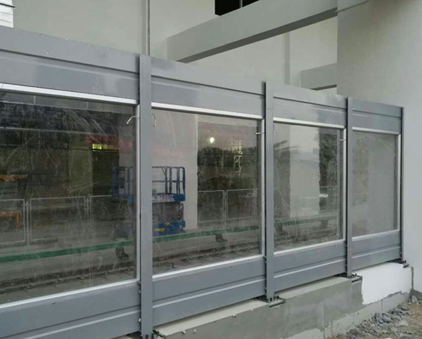 该车站进出口降噪隔音屏规格为2m高*1.5m ,采用1.2mm厚铝合金板,吸声屏背板压一道凹槽,透明材料采用10mm厚亚克力板,为防止车辆运行中对声屏障造成的冲击,透明隔声屏带有防脱落装置,以确保 和声屏障使用年限。